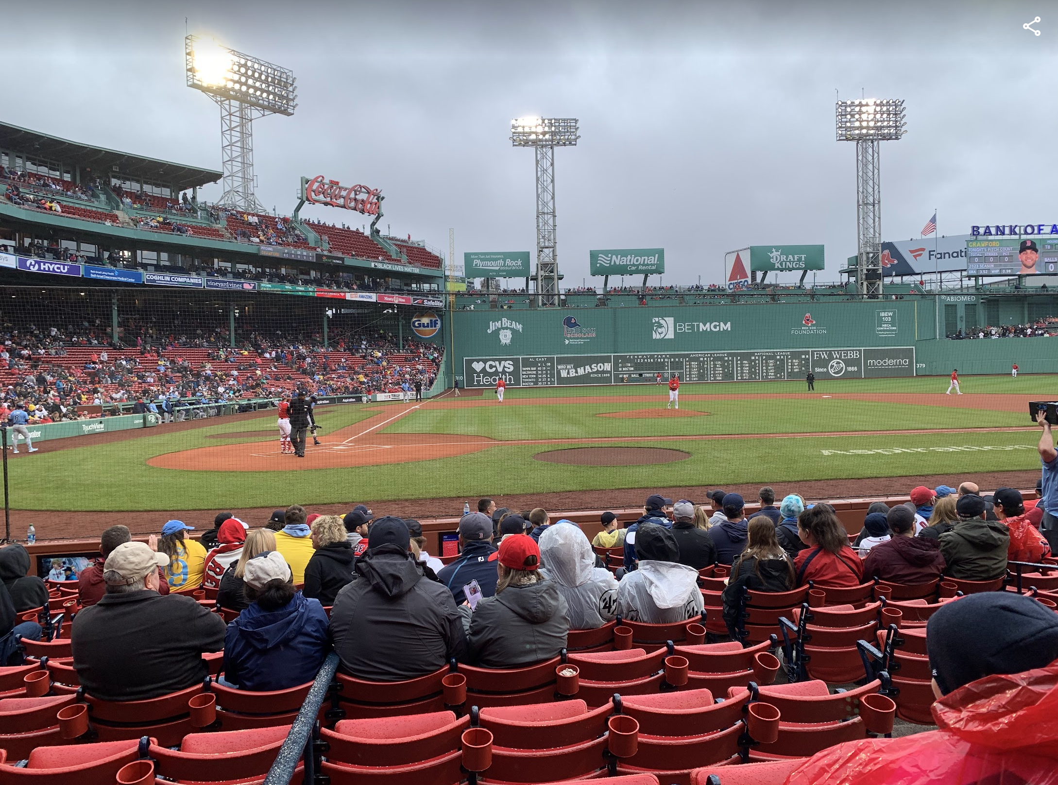 그린몬스터 뷰는 이렇다. 원래 부터 있는 좌석이라고 생각했는데 이천년대 초반에 리모델링하면서 새로 생긴 좌석이란다. 생각보다 높지는 않았던 듯. 문제는 너무 추웠다... 6월 초라고 믿을 수 없을 만큼 추웠고 큰 맘 먹고 350달러 짜리 야구잠바를 사입었다. 디자인이 맘에 들었지만 너무 비싸서 살까 말까 하다 결국 샀는데 야구장에 있는 동안 10명 가까운 사람에게 재킷이 멋있다. 어디서 샀냐. 얼마냐 같은 질물을 들었다. 굳이 뒷 자석의 사람이 날 불러서 물어볼 정도여서 잘 샀다는 생각은 들었지만 한정판 옷도 아니고 그냥 팀스토어에서 산 건데 그렇게 신기해하는지ㅎㅎ
